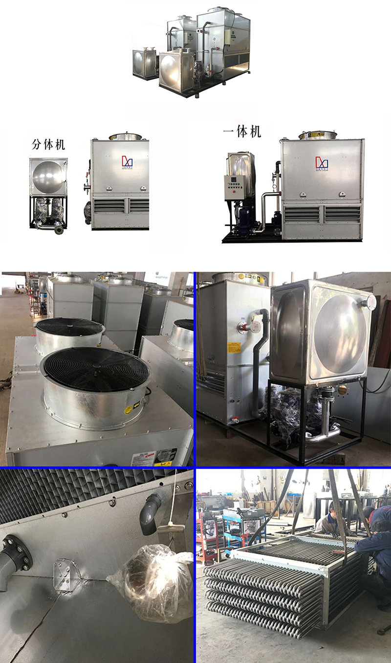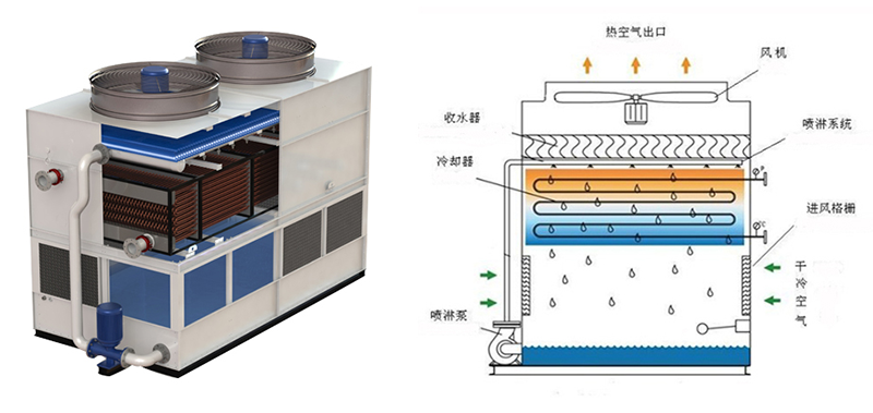 高溫工作流體進入表冷器,廢熱通過盤管外壁與下落的噴淋水接觸進行熱質交換并與底部進風的干冷空氣逆向交替形成飽和的濕熱空氣。熱量由頂部風機排出,水分則由特殊結構的脫水器擋回集水槽循環使用。