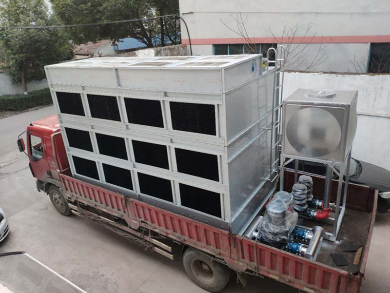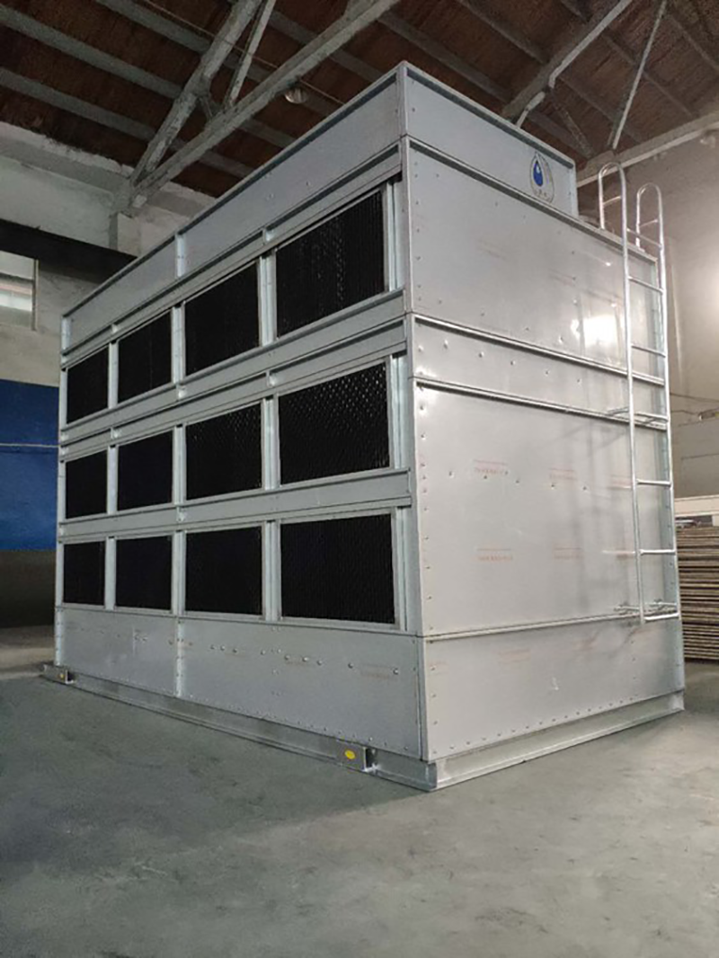 其中雙進風系統形式冷卻塔,散熱片、盤管雙邊布置,風機風筒,設計出更大的空氣流通面,冷卻效果更加。